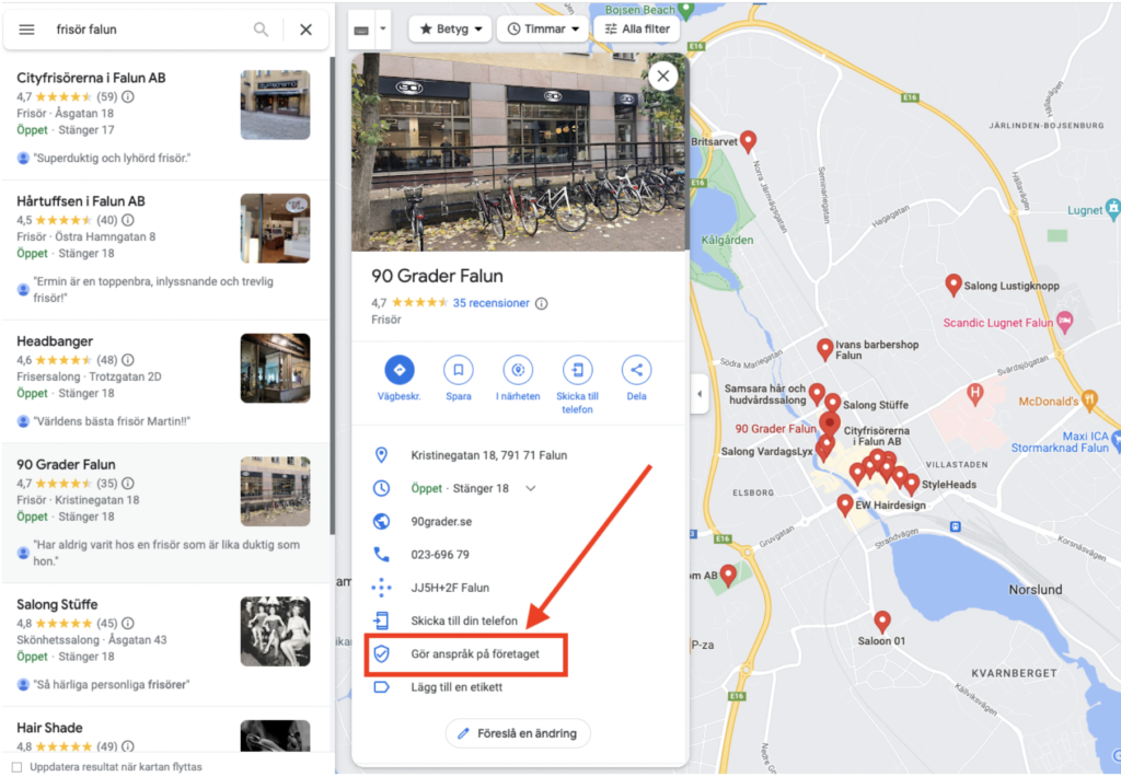 Om en Google Business Profile redan skapats för din verksamhet utan din vetskap, är det förmodligen så att Google har skapat en åt dig. Allt du behöver göra då är att ta över den, eller claima som det så ballt heter på engelska.