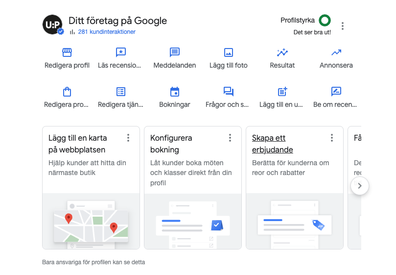 Det kallas som sagt för Google Business Profile, eller Google företagsprofil på svenska. Om du driver en verksamhet har den troligtvis en adress. Ett kontor, en butik, en mottagning eller dylikt. I företagsprofilen kan verksamheter ge all relevant info som en besökare kan behöva.