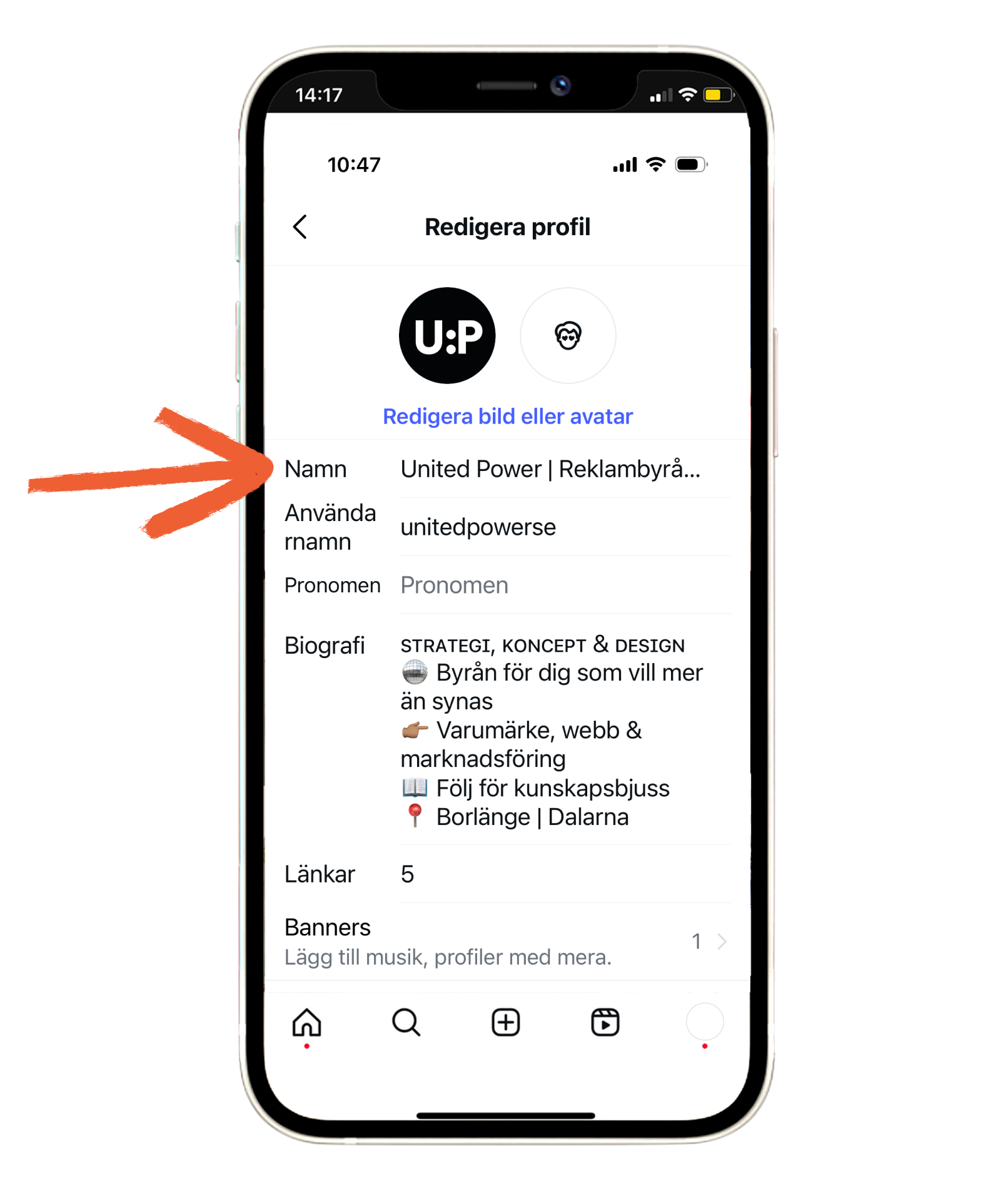 Tänk också på att både användarnamn och namn är sökbara på Instagram, så att ta tillvara möjligheten att pricka in nyckelord som kunder och andra målgrupper ofta söker på är alltid en god idé.