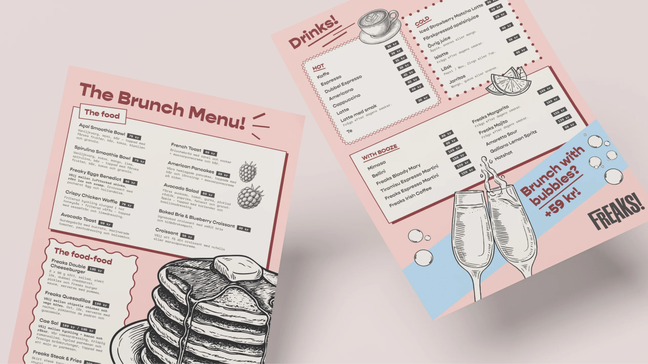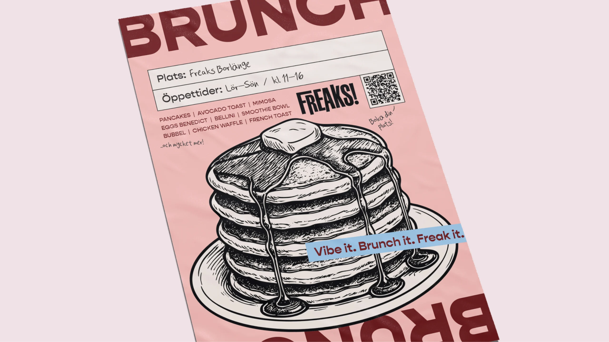 Freaks Brunch lanserades som ett tydligt koncept, inte bara en meny. Genom att kombinera strategi, tonalitet och genomförande skapades en ny anledning att besöka restaurangen dagtid. Brunchen blev ett naturligt komplement till kvällsverksamheten och ett steg i att bredda målgruppen och stärka varumärket långsiktigt.