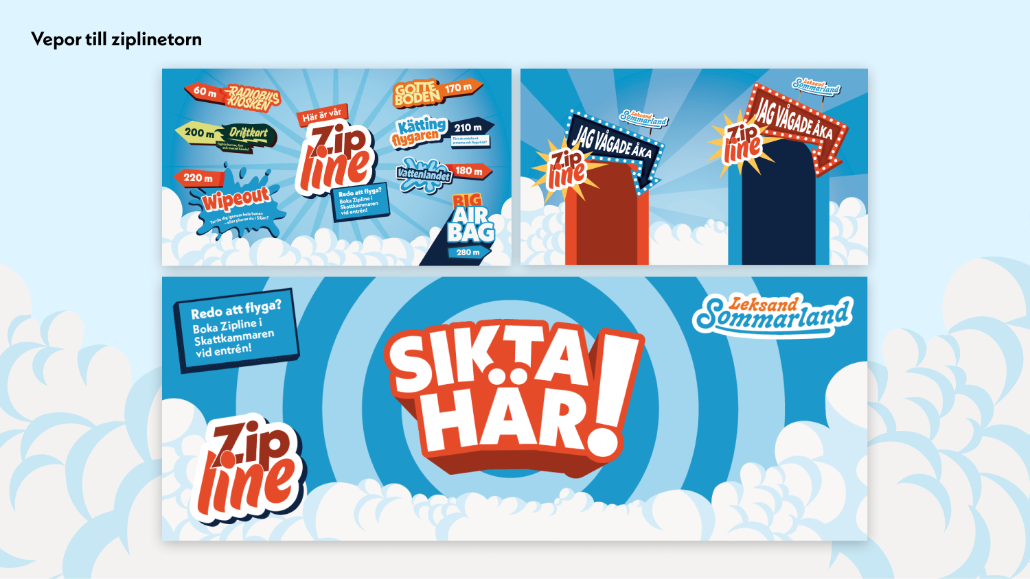 Vi tog fram ett visuellt koncept som harmonierar med Leksand Sommarlands lekfulla identitet, samtidigt som det är tydligt och lättläst i en miljö med mycket rörelse. Fokus låg på att: